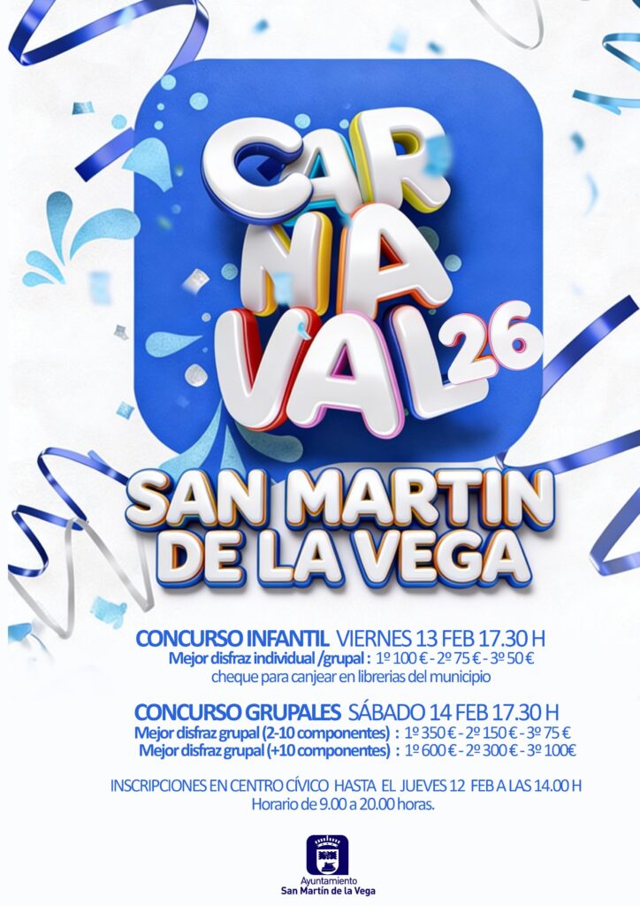 El Ayuntamiento de San Martín de la Vega, a través de la Concejalía de Festejos y en colaboración con las áreas de Juventud e Infancia y Mayores, ya se encuentra ultimando la programación de los Carnavales 2026, que se celebrarán del 13 al 18 de febrero en el municipio.